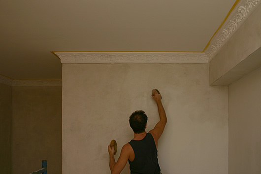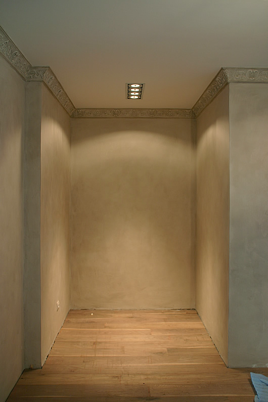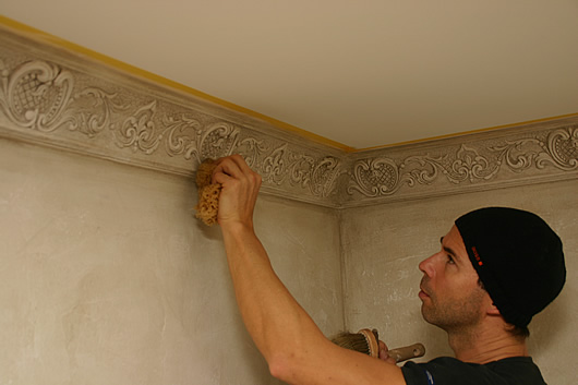 Raumsituation mit antik gestalteten Wänden und patiniertem Stuck