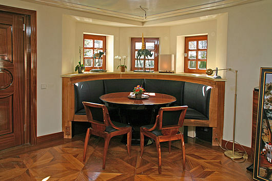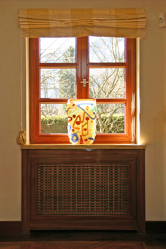 Auf Anfrage eines Kunden wurden in einer Villa sämtliche Fenster und Fenstertüren innen passend zum Einrichtungsstil mit verschiedenen Holzarten bemalt. Darüber hinaus wurde der Treppenaufgang mit dunklerem Mahagoniholz malerisch intarsiert. Eine besondere Herausforderung war die komplette Bemalung eines Schrankes in bernsteinfarbenem Zitronenholz sowie einem Wandregal in Mahagoni-Optik. Alle maserierten Objektflächen wurden nach der Gestaltung hochglänzend klarlackiert und sind somit hoch beanspruchbar. Die gemalte Ausführung wirkt täuschend echt und besticht durch die individuelle, malerische Note.