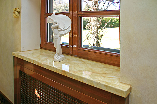 Im Zuge der Neugestaltung eines exklusiven Wohnbereichs erhielten die Fensterbretter innen eine edle, gemalte Steinoptik. Die Marmorsorte "Giallo di Siena" wurde hierbei farblich etwas zurückgenommen und auf die gesamte Fläche interpretiert. Fenster, Fensterbretter, Heizkörperverkleidungen und Wand fügen sich so in ein gefälliges, harmonisches Gesamtbild.