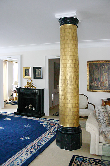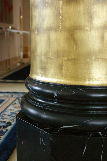 Bei einem anderen Auftrag diente der vorhandene schwarze Stein des Kamins als Vorlage für die Gestaltung einer Säule. In Kombination mit durchgeriebenen Blattgold egibt sich ein Raumelement, dass sich harmonisch in das prunkvolle Ambiente einfügt.